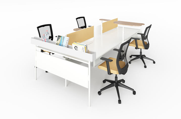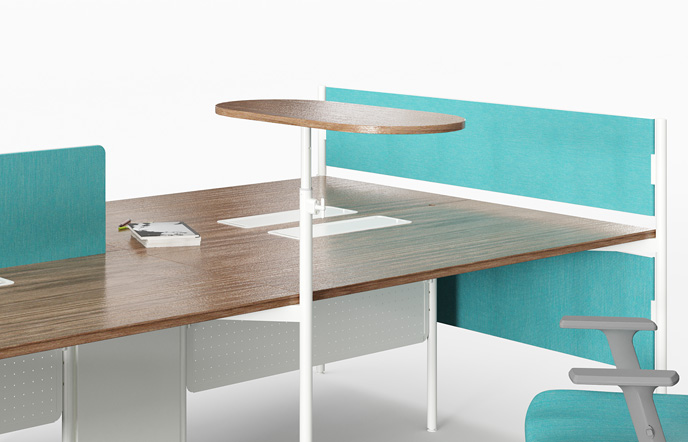 Side tray with additional shelf, for oft-used items and shared for collaboration.